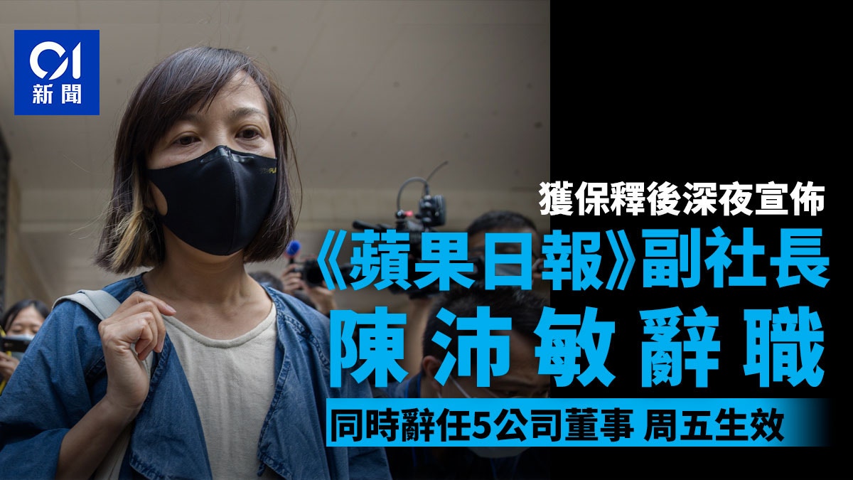 Jun 24, 2021 · 早前被國安處以涉串謀勾結外國或境外勢力危害國家安全罪被捕、獲保釋的《蘋果日報》副社長陳沛敏,今日(24日)將辭去一切職務,以及5間公司董事職務,周五(25日)生效。